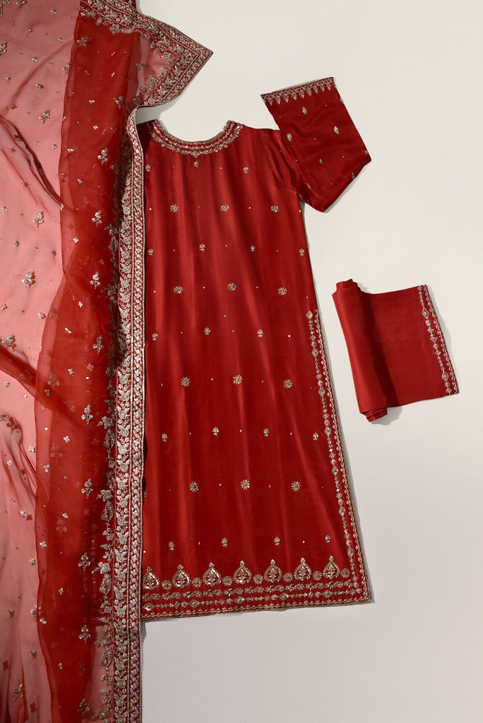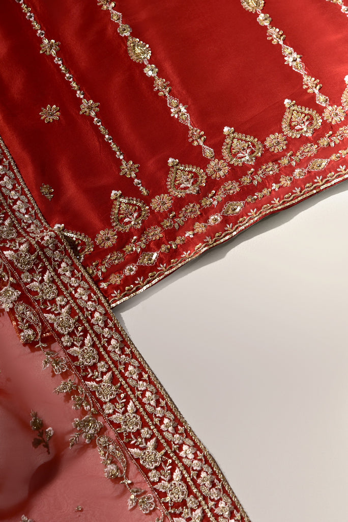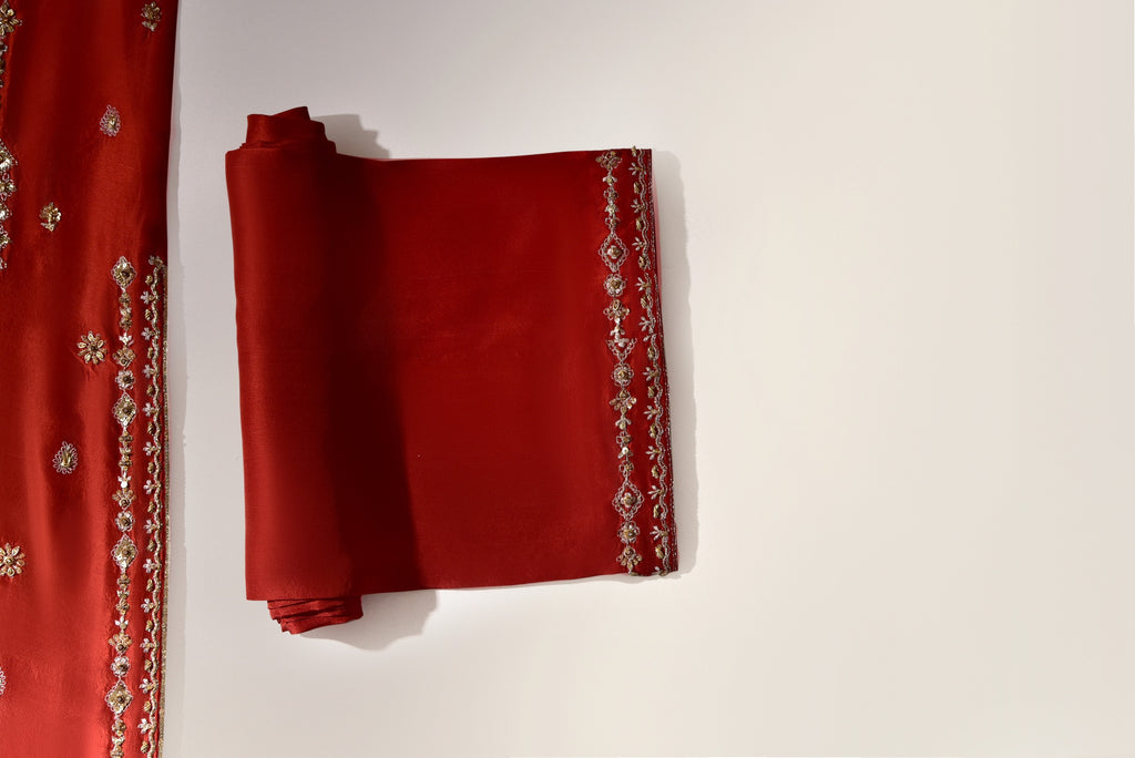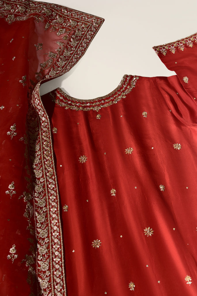 Experience the art of effortless elegance with the ethereal " Cila " ensemble. Offering a traditonal timeless silhouette on pure raw silk, heavily adorned with zari and sequins details. Paired with a matching pure raw silk trouser alongside a pure soft tissue organza. This ensemble exudes grace and sophistication, making it a beloved and essential addition to any wardrobe. The length of the long kameez is 47 inches.