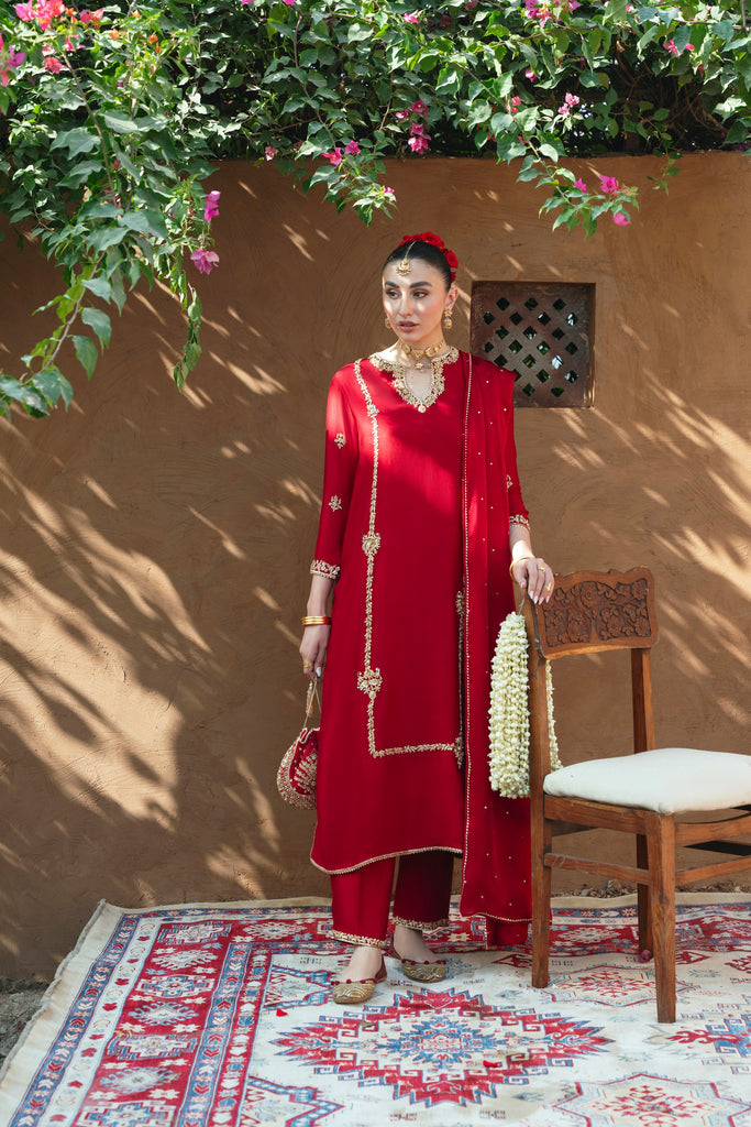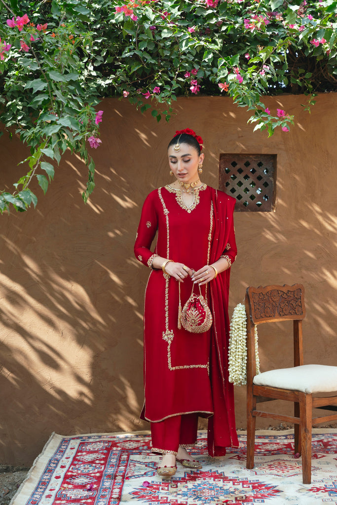Curated on korean silk in the beautiful maroon jewel hue. Kaur is adorned with the most intricate, gold Ada/handwork of dabka, naqshi, sequins, moti and katori nug, done by our expert artisans. This design is paired with a matching pure soft tissue organza dupatta featuring sequins chaath and matching trousers as seen. Kaur will be your new favourite this festive season. The length of the long kameez is 48 inches.