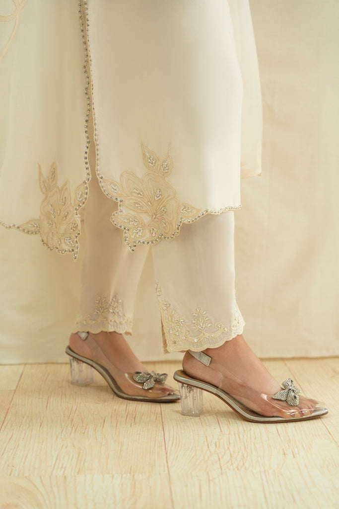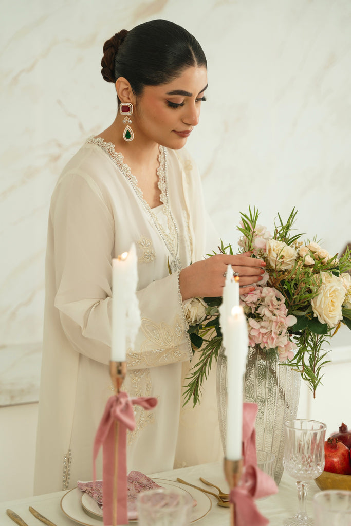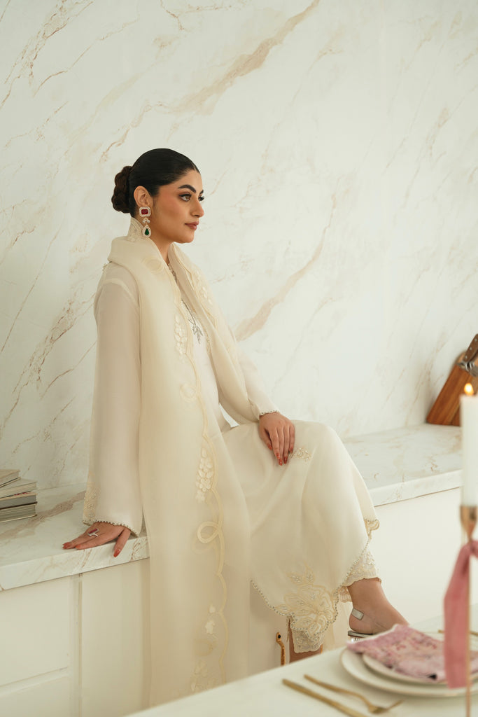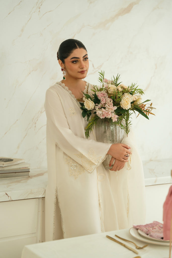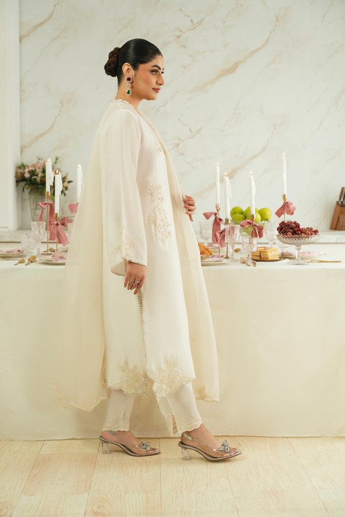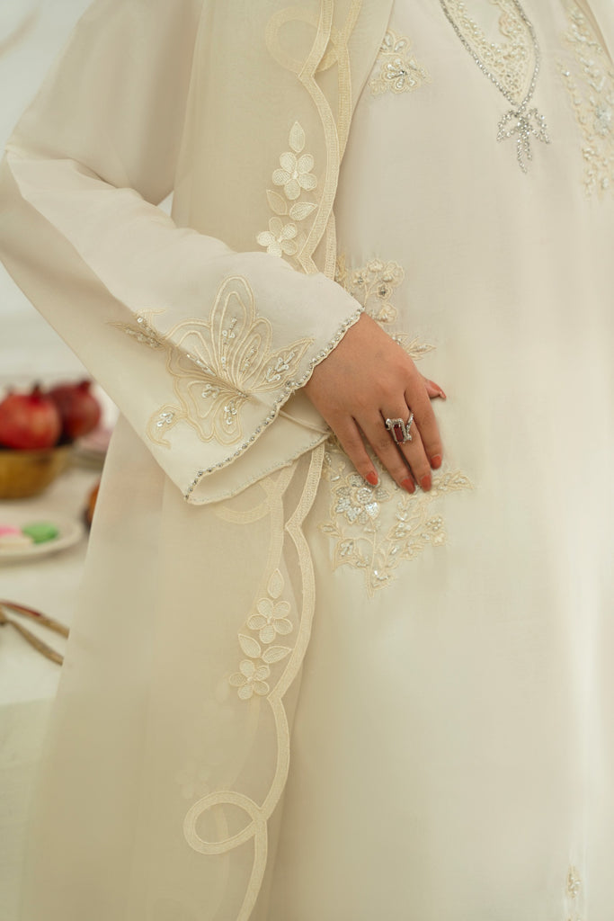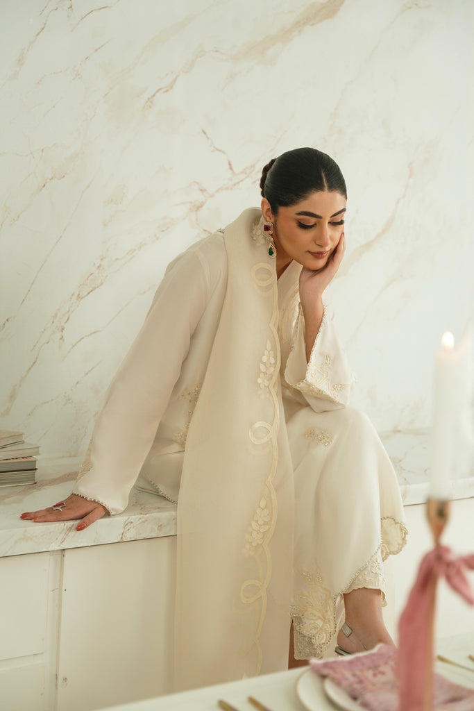 This beautiful design embodies the very essence of ethereal elegance curated on ( pure 60gms ) ivory in a long length kameez silhoutte. Heavily embellished with threadwork and clusters of sequins, cutdana and motee , each stitch is a testament to generations of artistry, whispering tales of heritage and tradition. The Opal masterpiece comes together with a matching soft tissue matching dupatta and bottoms as seen. Our signature elegance, stitched into every seam. The length of the kameez is 47 inches.