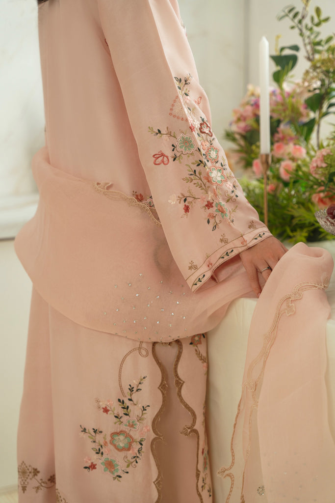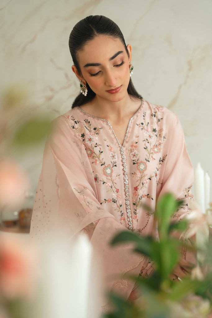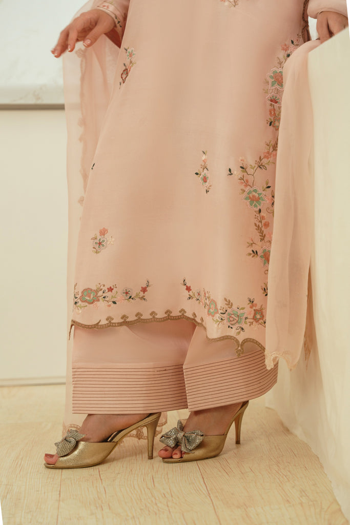 Shameen, with its beautiful pure raw silk 60 gms silhouette, is a celebration of craftsmanship and signature Agha Noor details. Shameen, is an absolute beauty, featuring intricate pretty threadwork, that adorn the entire piece. The neckline adds a touch of regality, while the cutwork detailing on the sleeves lends a contemporary and alluring charm to the overall look. Paired with a soft tissue organza dupatta with tiki stone bows, and straight trousers as seen. A three piece that you will keep coming back to. The length of the long Kameez is 47 inches.