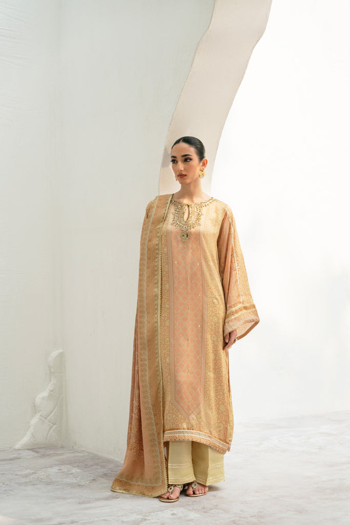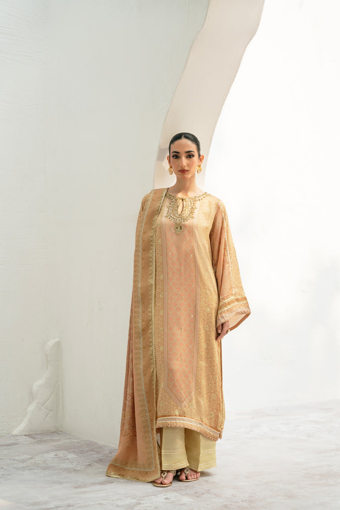 Discover Agha Noor's festive prints created with utmost detailing alongside immaculate tailoring. A canvas of stunning raw silk, is printed with uplifting florals. Enhanced with a gold zardosi handwork neckline with dabka, naqshi, sequins and crystals. Styled with a printed charmeuse dupatta and shalwar as seen.
