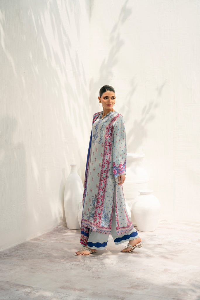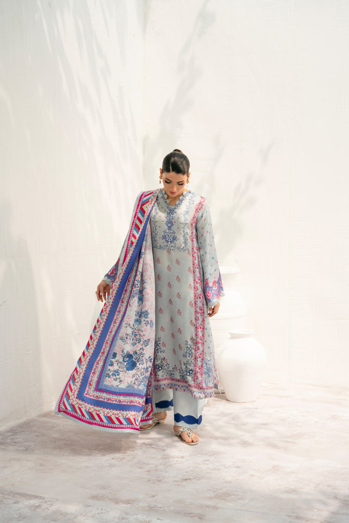 Discover Agha Noor's festive prints created with utmost detailing alongside immaculate tailoring. A canvas of stunning ice blue from raw silk, is printed with uplifting florals and eye-catching shades of ivory and navy blue. Enhanced with a silver zardosi handwork with dabka, naqshi, sequins and crystals. Styled with a printed charmeuse dupatta and trousers as seen.