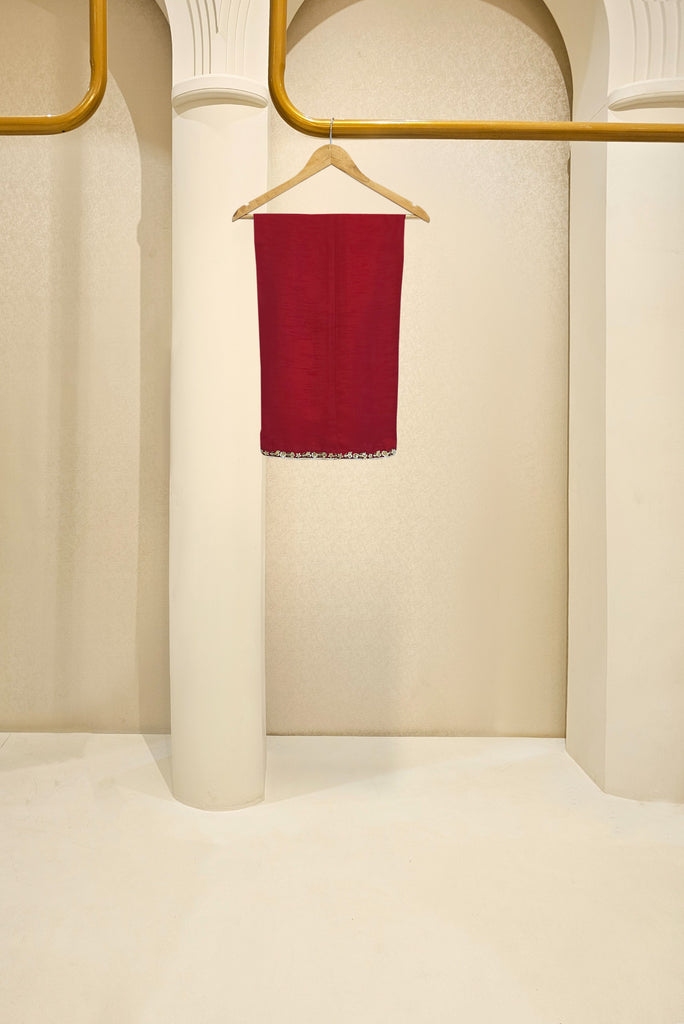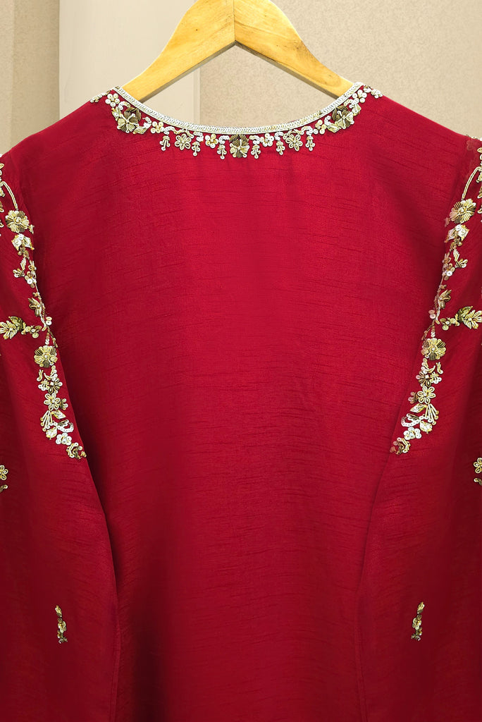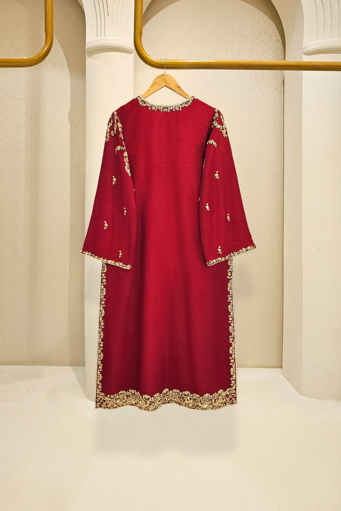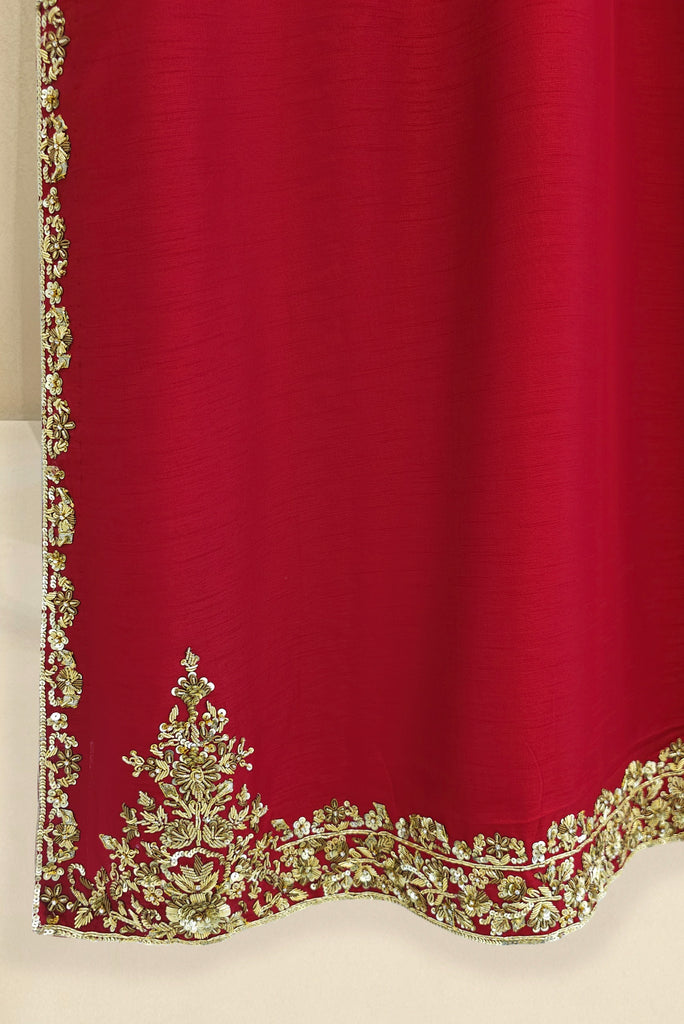 The signature Agha Noor details that are hard to miss. Cut from korean raw silk on an alluring crimson canvas, '' Zella '' is an absolute must have. Heavily embellished with gold ada/handwork consisting of dabka, naqshi, sequins and nug, done by expert artisans taking upto 300+ hours, with a matching korean raw silk Izaar as seen, the pure tissue organza dupatta is adorned with sequins and boti spray. The length of the long kameez is 48 inches.