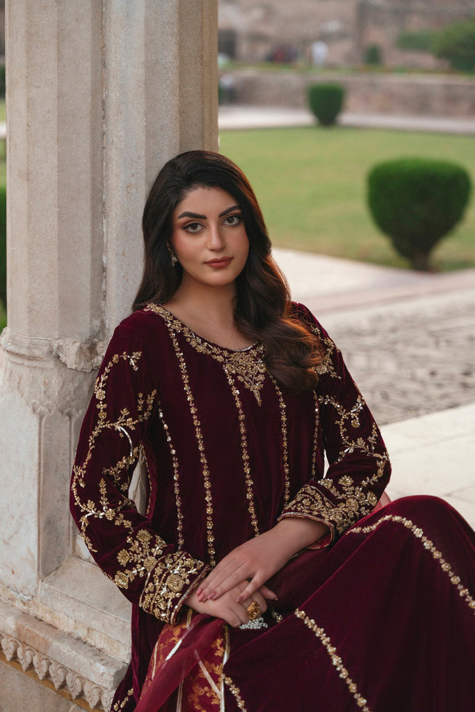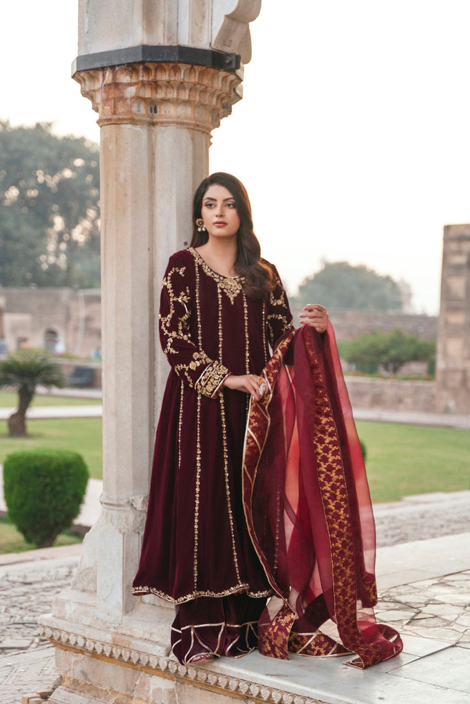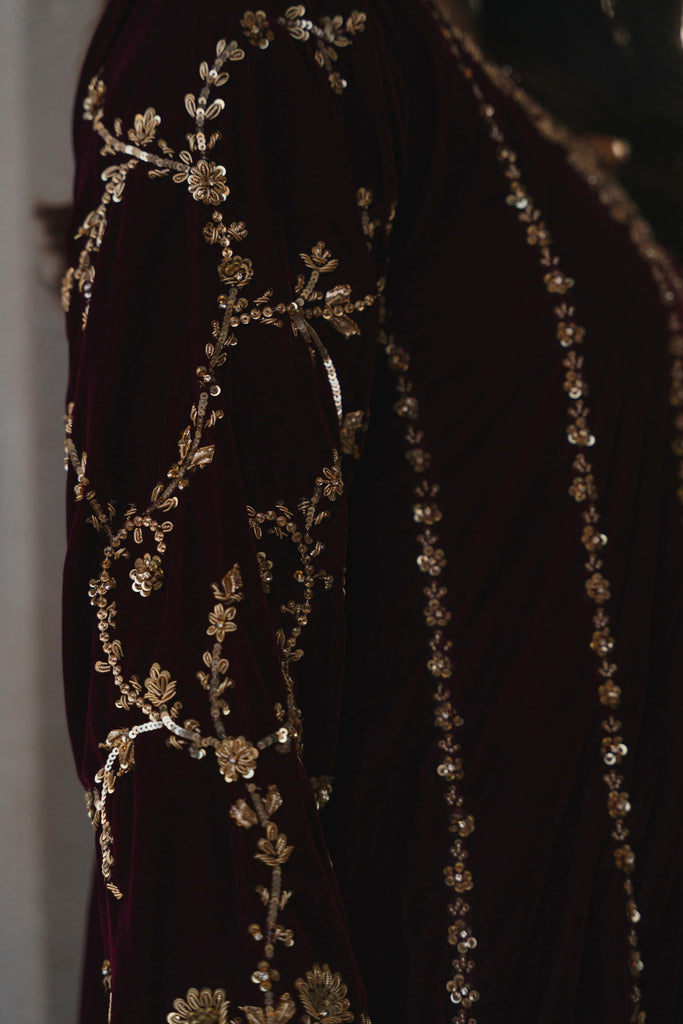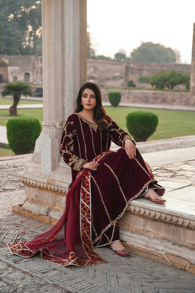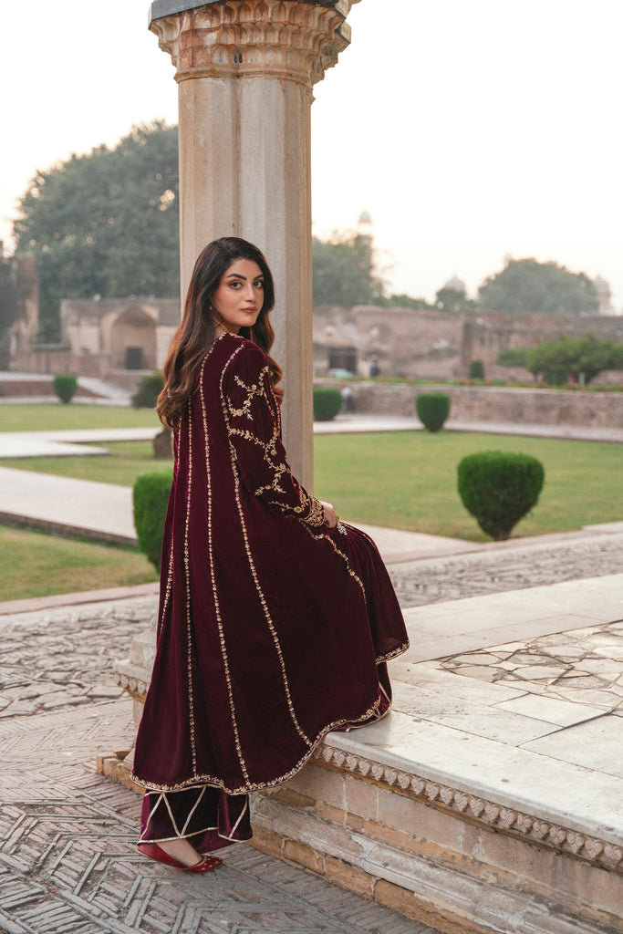 A rich burgundy velvet long kalidaar anchors this beautiful ensemble with confidence, its flowing silhouette traced by vertical trellis of handwork in dabka, naqshi, sequins, nug and moti. This detailed ada work follows the natural fall of the fabric, adding structure and depth to the velvet's plush finish without overpowering its form. A matching velvet izaar, finished with delicate gotah detailing, grounds the look, while an organza dupatta edged with glistening jamawar borders introduces balance in contrast. Together, the elements reflect a carefully curated design rooted in heritage. The length of the long kalidaar is 48 inches.