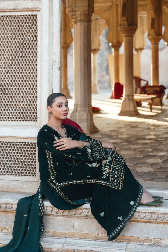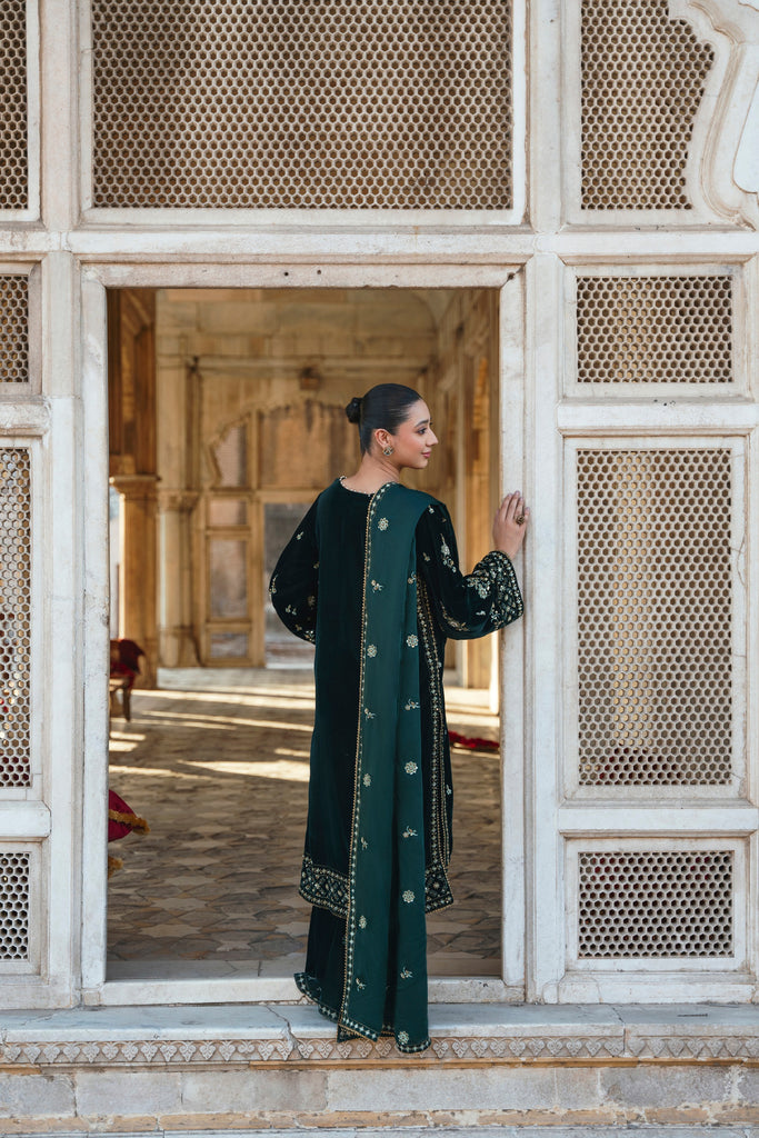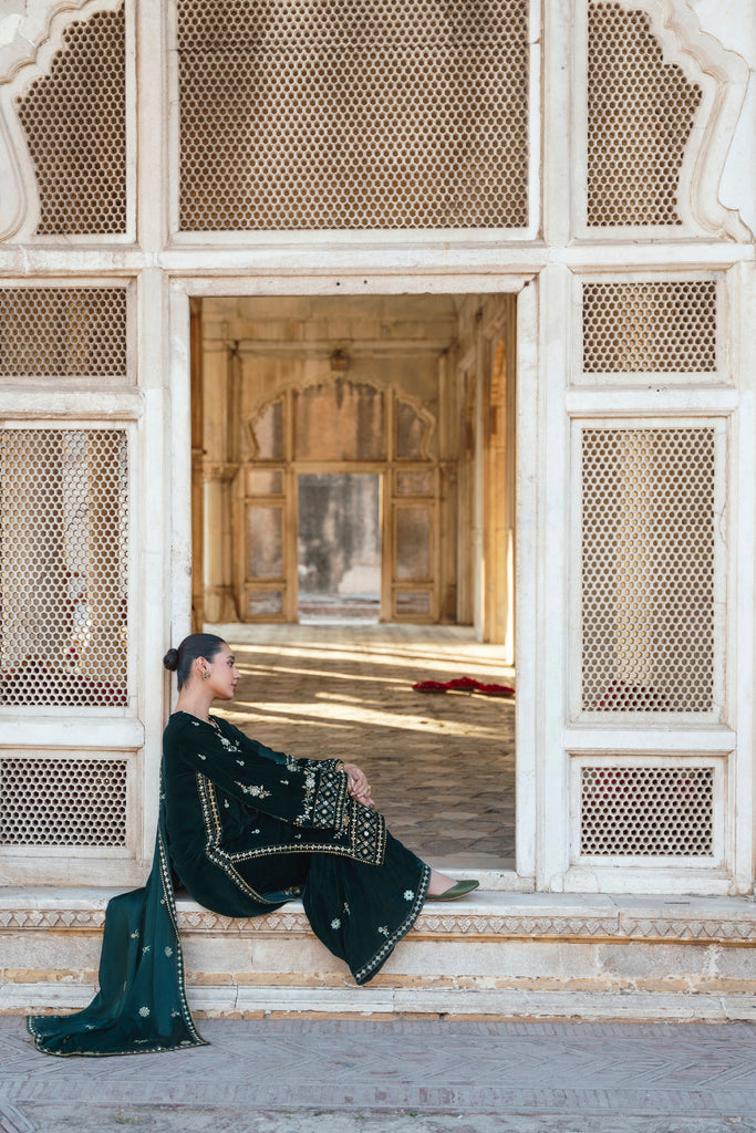 This stunning three piece is thoughtfully curated with intricate details. The mirage of plush poison green velvet canvas with gold tilla and zardosi craftmenship make up for Mahdisa. The soft V-neckline with heavily embellished borders suggest the weighted detailing of heirloom formal wear. Botanical motifs lean towards stylised flora rather than literal blooms, suggesting a folk-deriven sensibility, refined for traditional dressing. Styled with a deep poison green silk izaar and silk dupatta embelished with matching borders, creating a poised expression of winter occasion wear. Turn heads this festive season with understated elegance in Mahdisa.