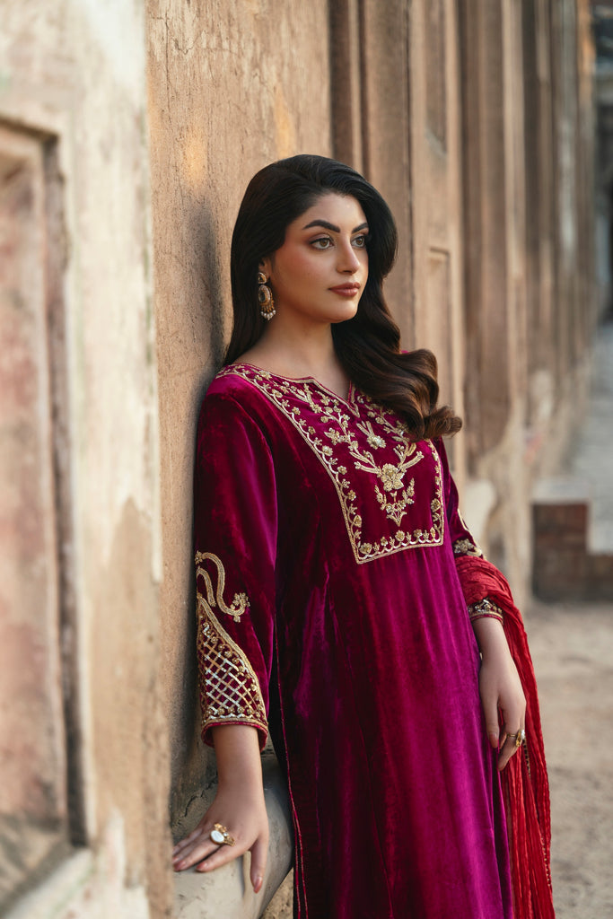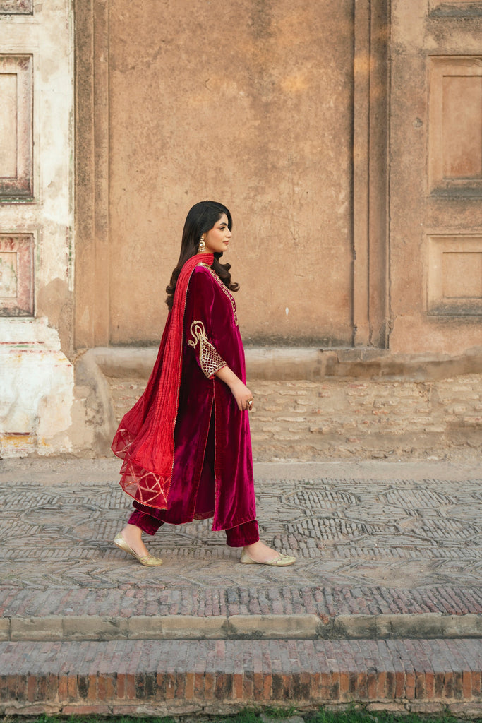 A gorgeous three piece velvet set curated in a rich beetroot hue blends a long kameez, floral zardozi and criss-cross sleeve accents with a hot pink crushed dupatta, creating a stand out look perfect for your wedding festivities. The length of the long kameez is 48 inches.
