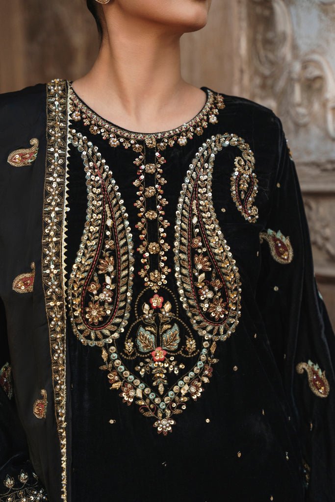 This beautifully curated velvet three piece is inspired by the mughal era artistry, defined by paisley medallions with intricate gold zari alongside hand/ada zardozi craftmenship across a deep midnight canvas. The border on the hem is articulated through ornate florals, recalling the refinement of historic textile margins and traditional shawl patterns. Intentionally designed in both motif placement and proportion, this beautiful design is perfect for festive winter evenings, where heritage reference and thoughtful detailing shape the aesthetic rather than fleeting trend.