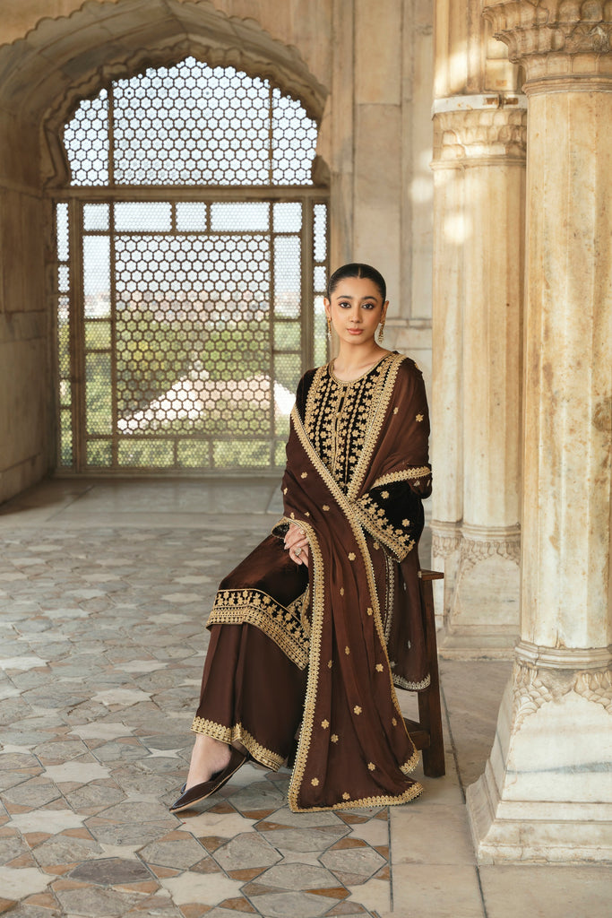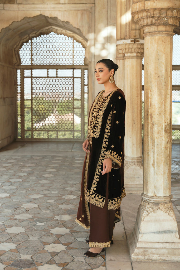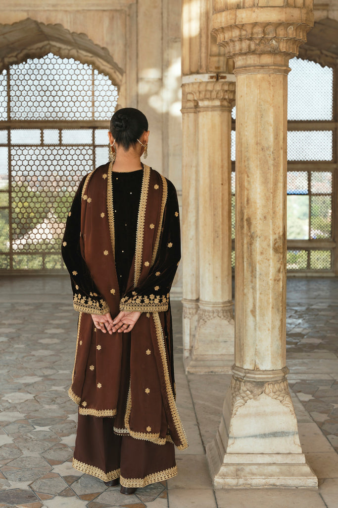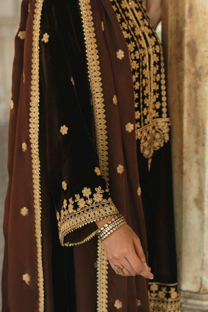 A dark espresso velvet choga is heavily adorned with rich gold dori elements. If you like subtle elegance, this versatile look is for you, the look is complimented with matching silk Izaar and shamus silk dupatta featuring gulab boti's alongside a border on four sides as seen. The length of the Roshan choga is 45 inches.