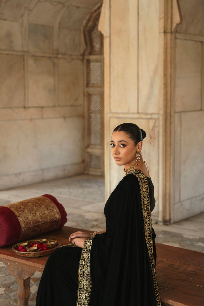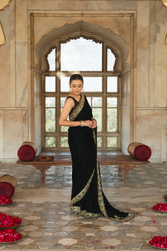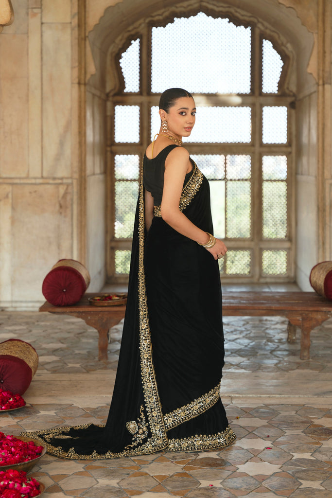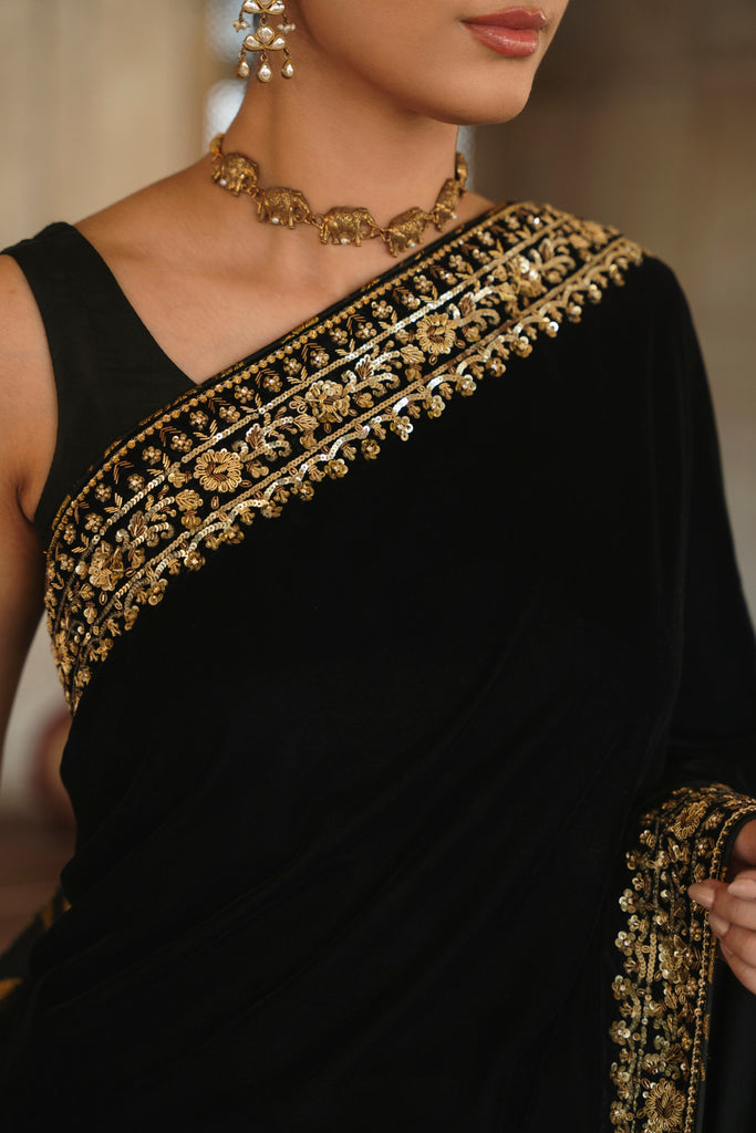 Timeless glamour, this crimson black velvet saree will be turning heads, heavily embellished with intricate gold zardosi borders in dabka, naqshi, sequins and katori nug, with three camellia inspired motifs on the paloo. Eight yards of luscious pure velvet and a silk blouse. This gorgeous design will be your perfect choice for wedding festivities.