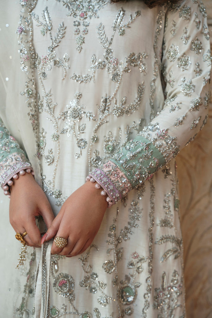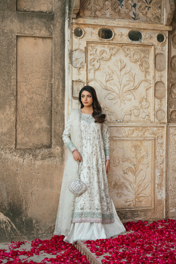 A luminous ivory Korean silk canvas carries intricate silver zardozi flora in a composition that feels both ornate and intentional. The hand/ ada work unfolds in a vine-like narrative, offset by cotton candy pink borders and pastel jade tones with powdery lilac accents that temper the shimmer. These multi-hued hems add structure to the silhouette, creating a balance between softness and form. Finished with a coordinating potli, this is a wedding wear look that feels polished, embodying a tenderness that is as graceful as it is celestial. Styled with a matching korean silk skirt anda pure organza dupatta with an intricate hand scalloped border on four sides. This alluring ensemble exudes grace and elegance, making it a beloved addition for your festive occasions. The length of the long kameez is 48 inches.