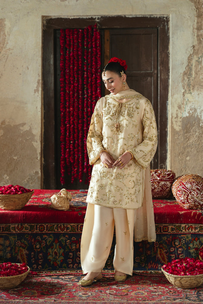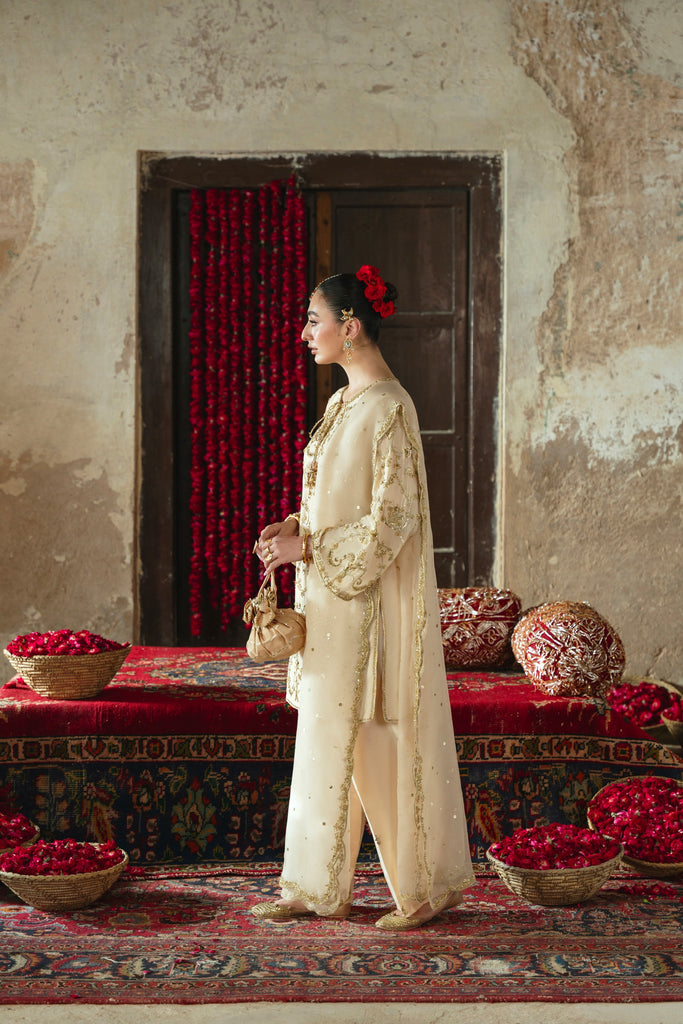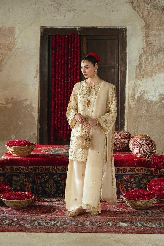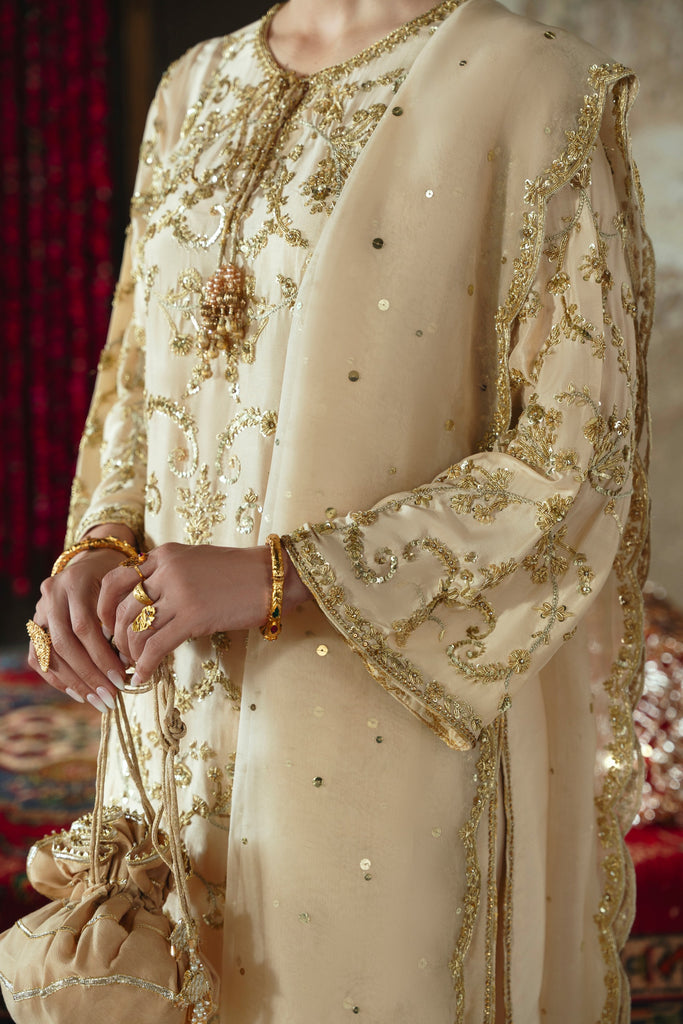 Curated on pure raw silk 60gms in the beautiful soft gold hue. Mehtaab is adorned with the most intricate, gold Ada/handwork of dabka, naqshi, sequins, moti and katori nug, done by our expert artisans, painstakingly taking upto 400+ hours. This design is paired with a matching pure soft tissue organza dupatta featuring a hand scalloped embellished border on 4 sides and a matching shalwar as seen. Mehtaab will be your new favourite this festive season. The length of the kamneez is 36 inches.