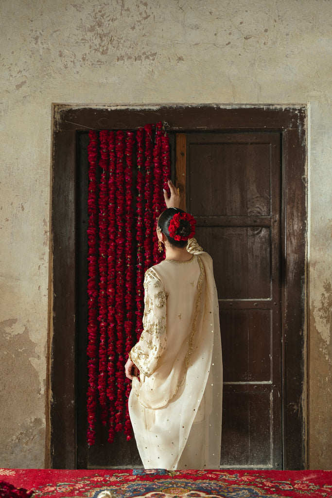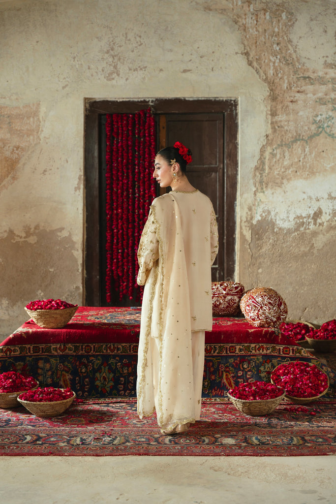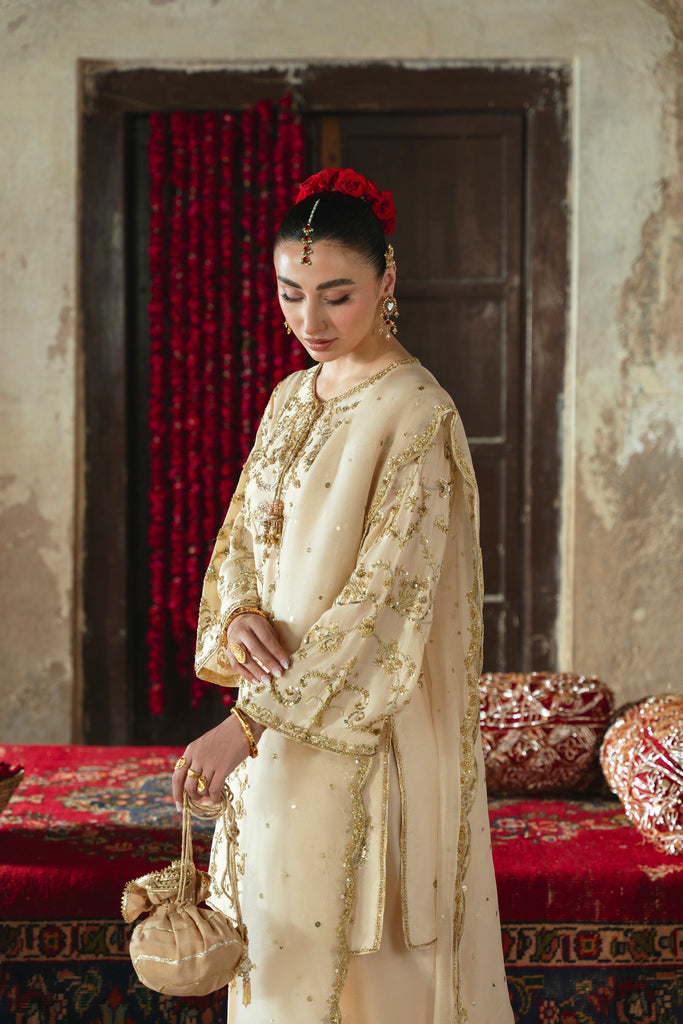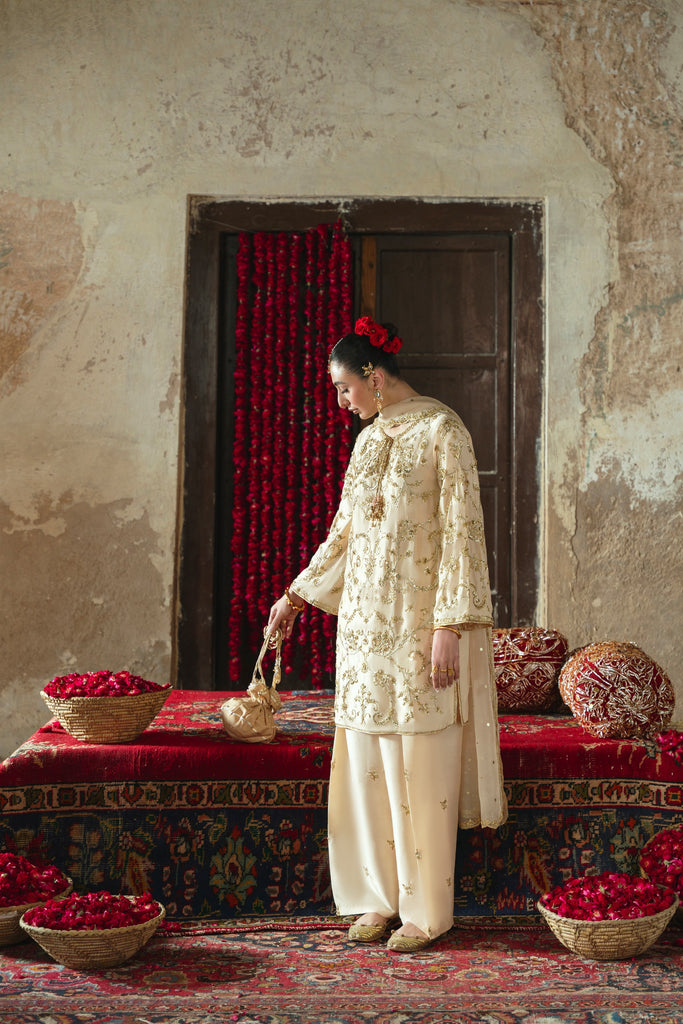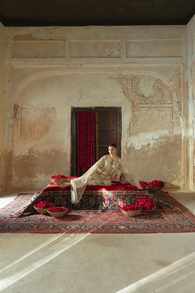 Curated on pure raw silk 60gms in the beautiful soft gold hue. Mehtaab is adorned with the most intricate, gold Ada/handwork of dabka, naqshi, sequins, moti and katori nug, done by our expert artisans, painstakingly taking upto 400+ hours. This design is paired with a matching pure soft tissue organza dupatta featuring a hand scalloped embellished border on 4 sides and a matching shalwar as seen. Mehtaab will be your new favourite this festive season. The length of the kamneez is 36 inches.