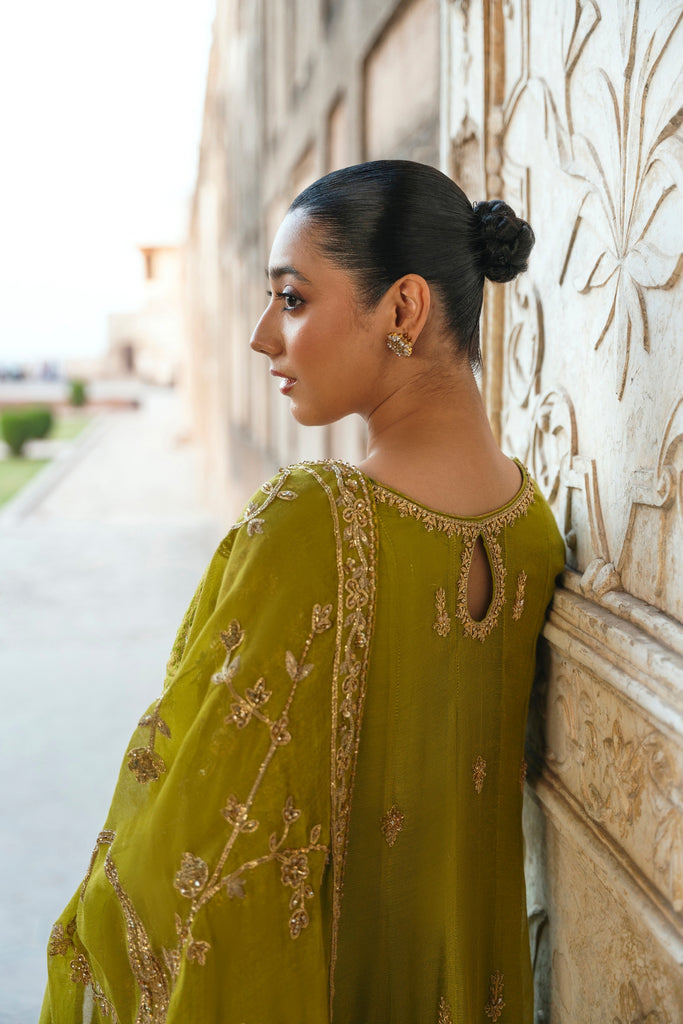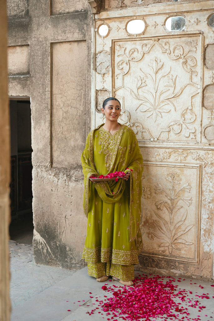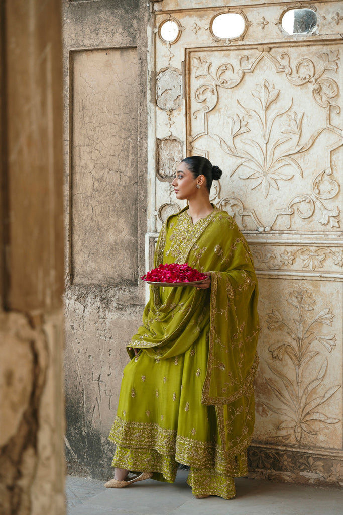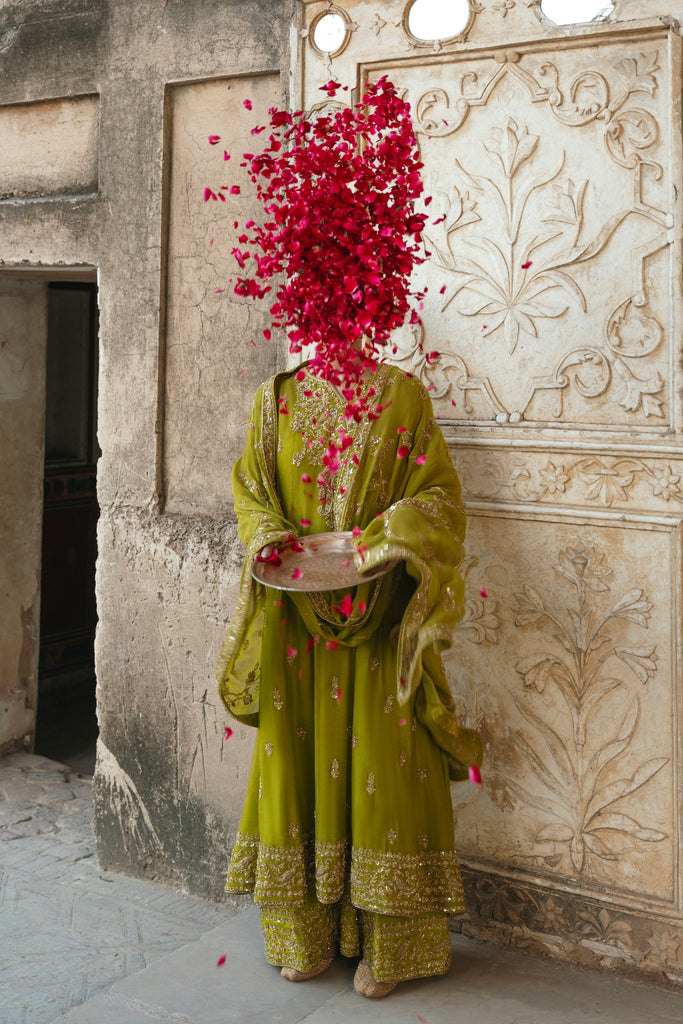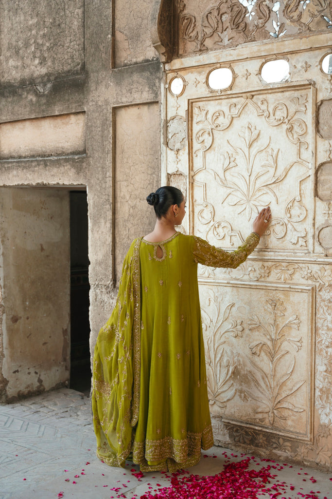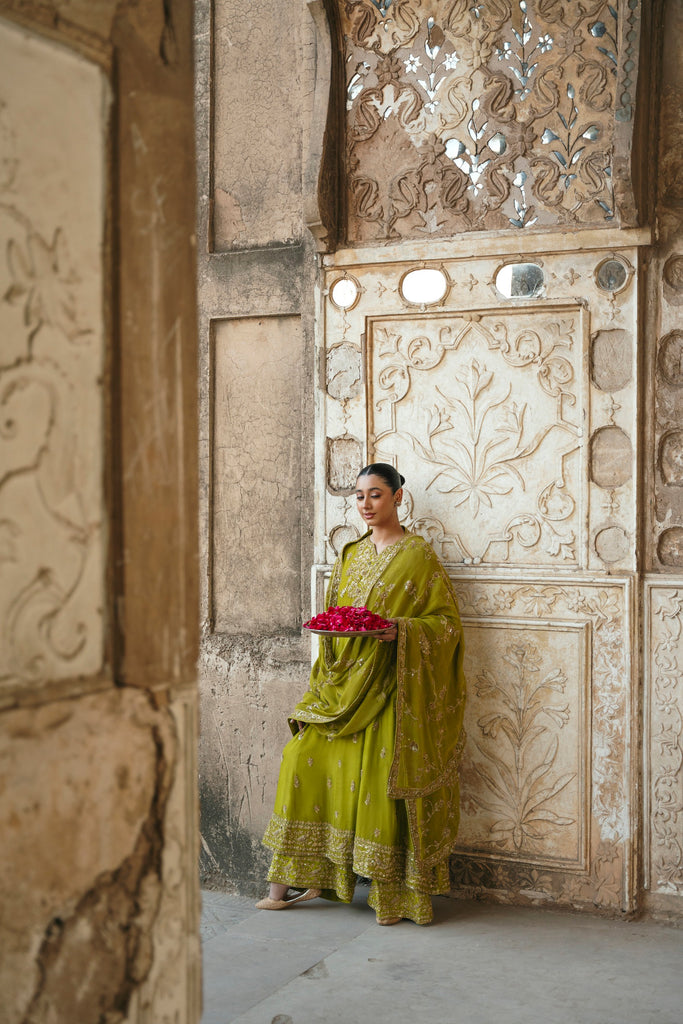 A cascading long mehndi green kalidaar, detailed to perfection with handwork in dabka, nagshi, nug, sequins, and moti. The carefully curated design reflects a refined approach to nuanced dressing. The handwork unfolds across the silhouette with careful precision, allowing every element to feel expressive yet composed. Paired with a matching embellished silk izaar and an ornately detailed pure organza shawl, this beautiful showstopper will have you turning heads. Designed for occasions that call for cultural richness and visual impact. The length of the long kalidaar is 50 inches.