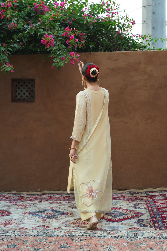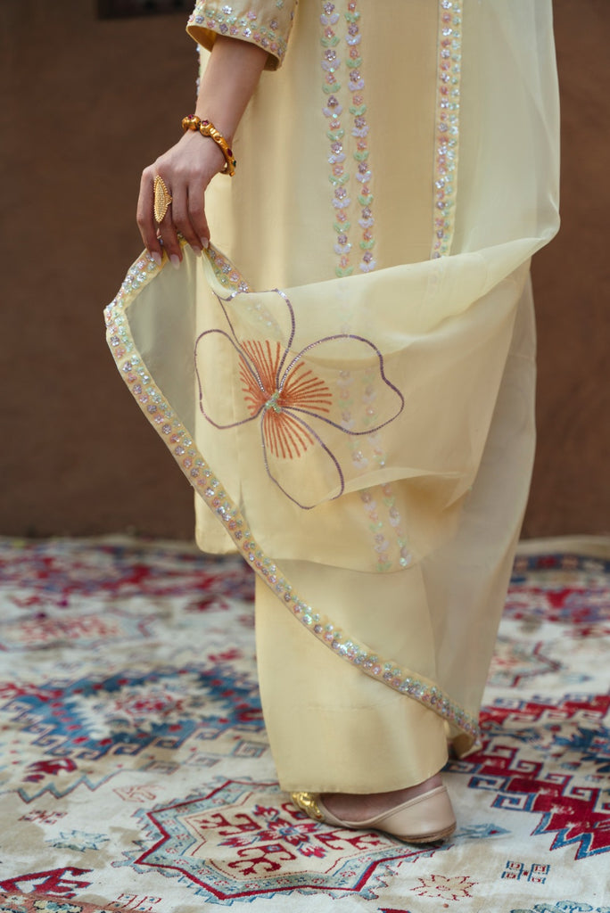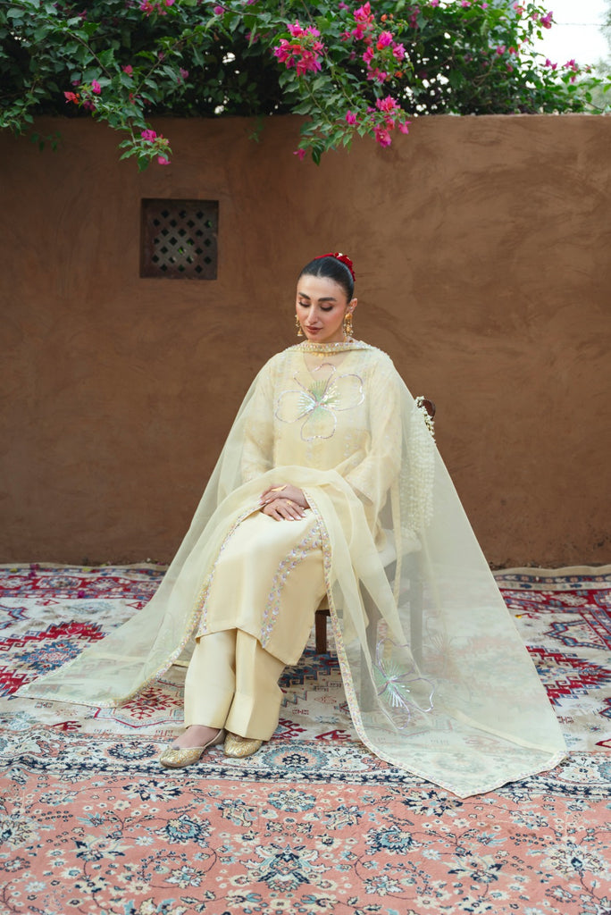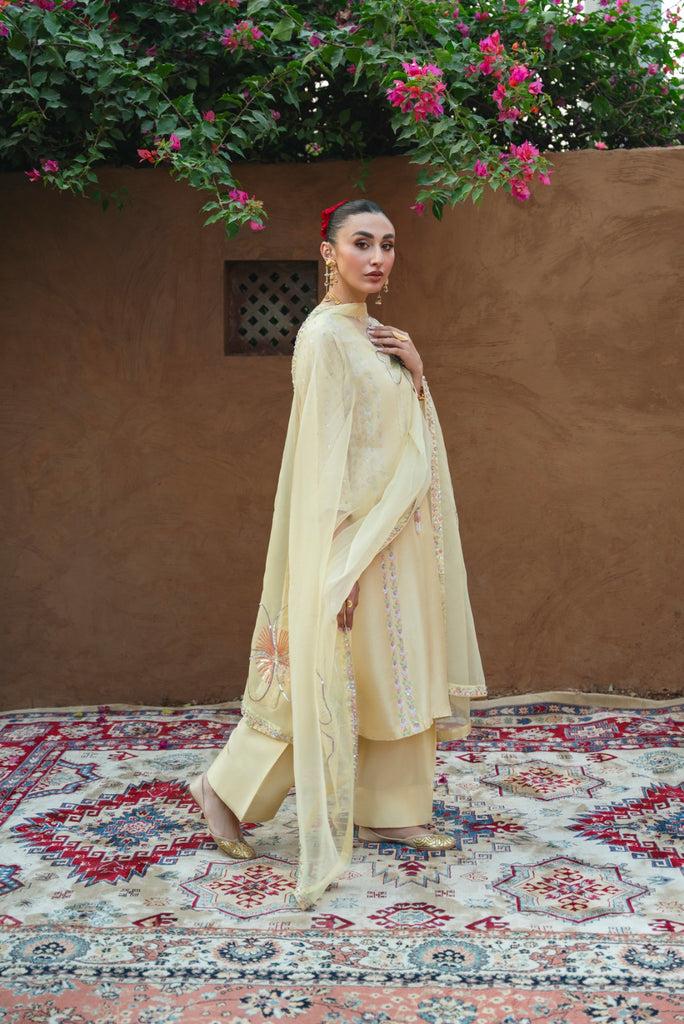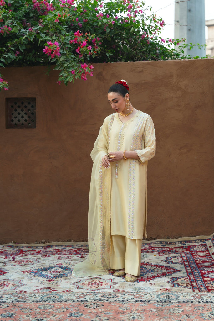 Curated on the finest pure raw silk in the beautiful pastel tone of butter yellow. Nagar Bano is heavily embellished with the most intricate sequins work, done by our expert artisans. This alluring design is paired with a matching dupatta featuring florals and matching shalwar as seen adorned with a border on the hem. The length of the long kameez is 48 inches. This versatile design can be styled for Nikkah and Valima events alike.