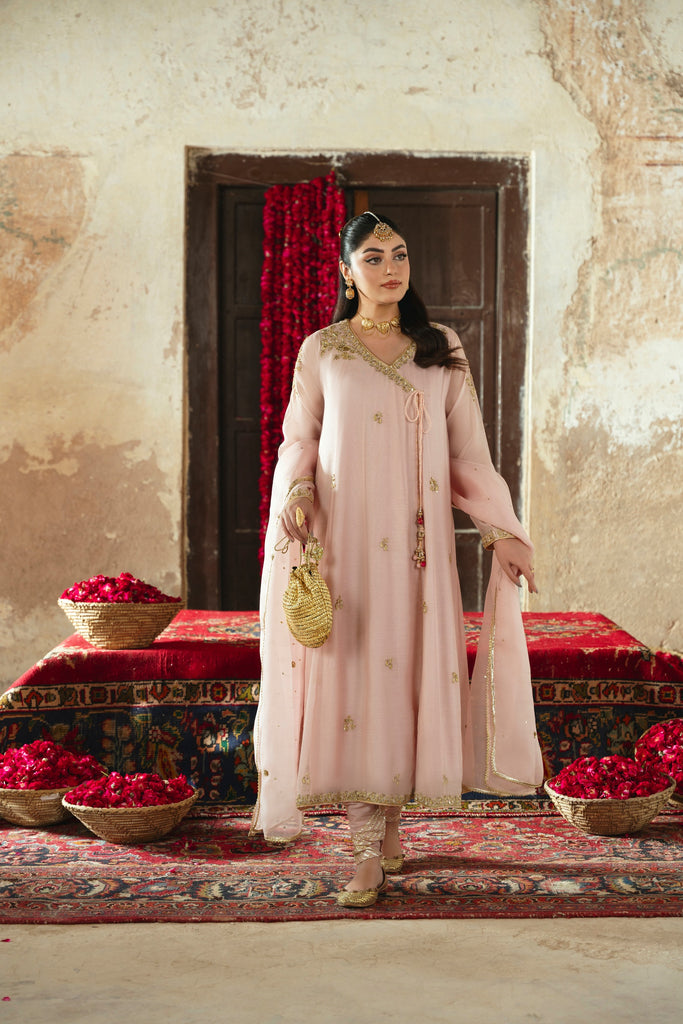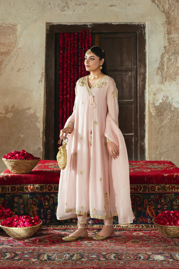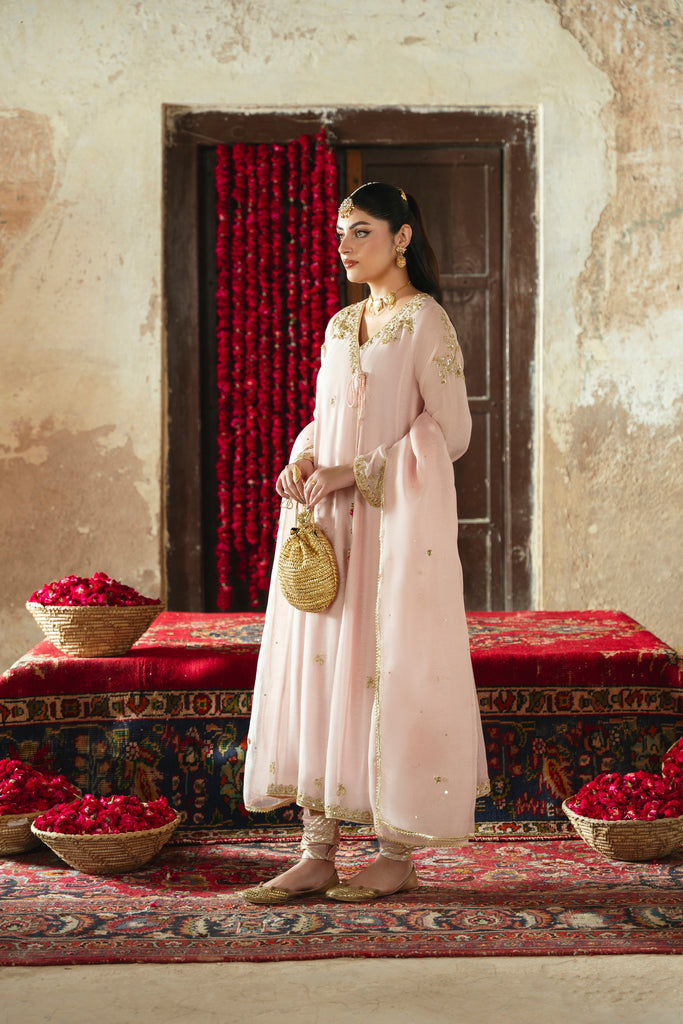 Curated on pure handloom cotton net in the most beautiful dusky pink Kashmiri chai hue. Rani Bagh is adorned with the most beautiful intricate gold Ada/handworkof dabka, naqshi, sequins, moti and katori nug. This design is paired with a matching pure soft tissue organza dupatta and chooridar with gotah accents. If you like subtle elegance, Rani Bagh will be your new favourite this festive season.