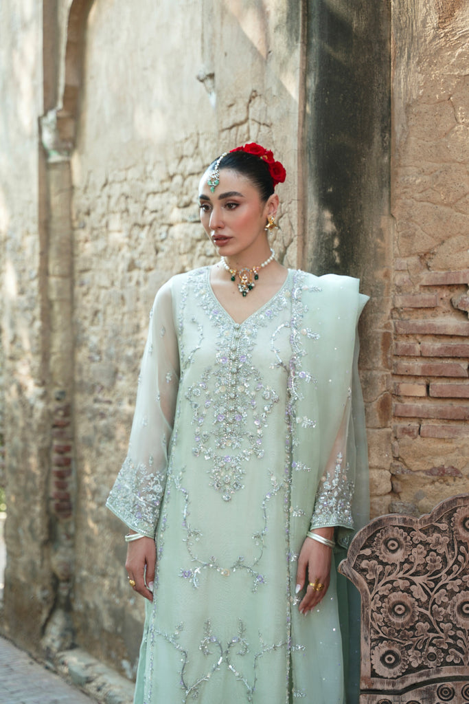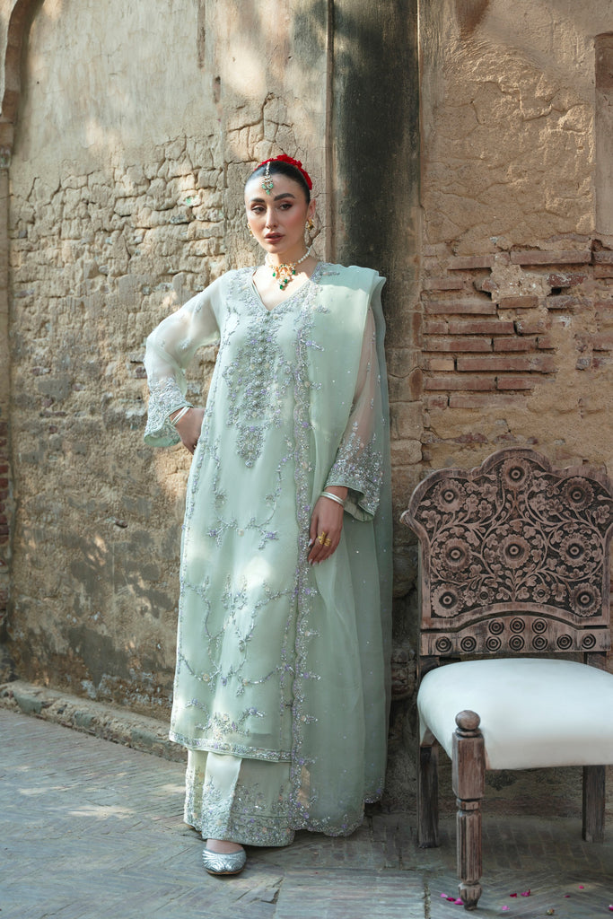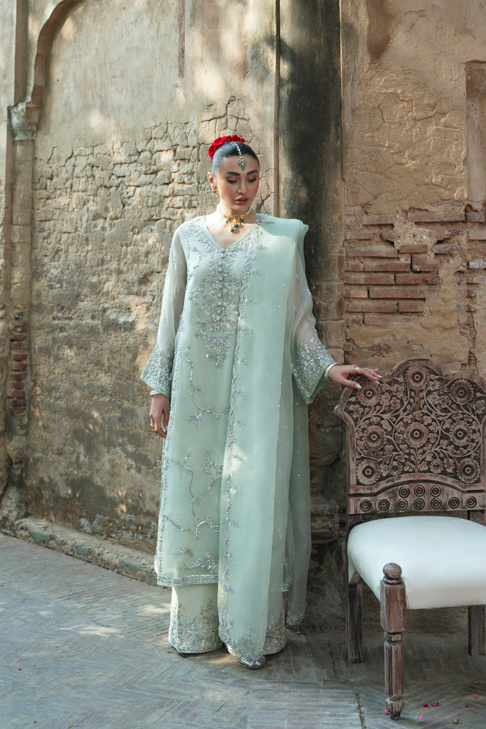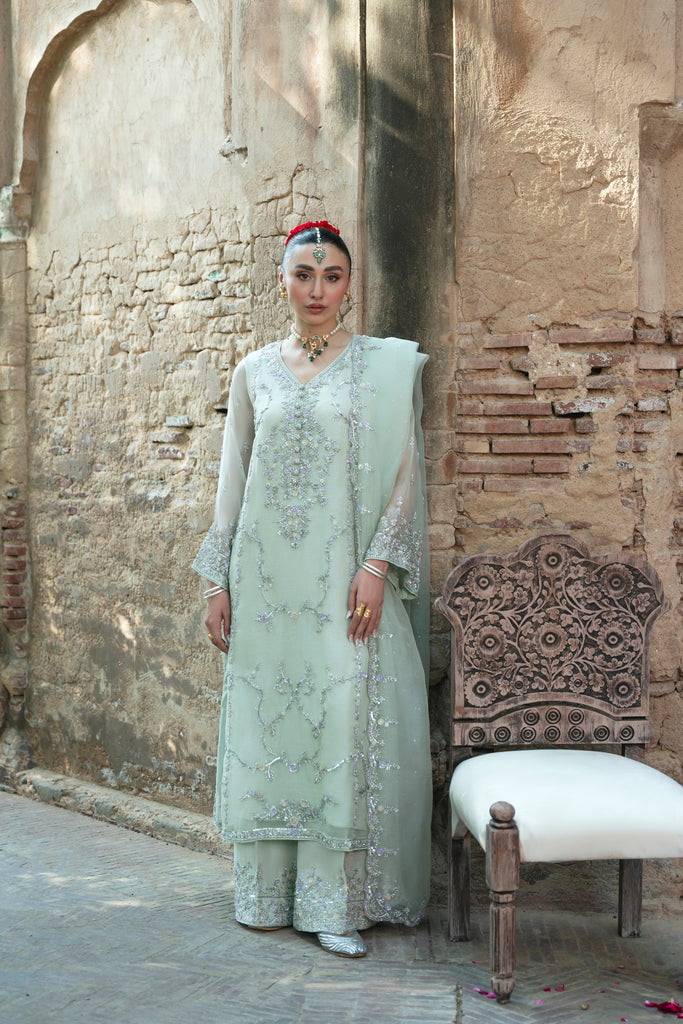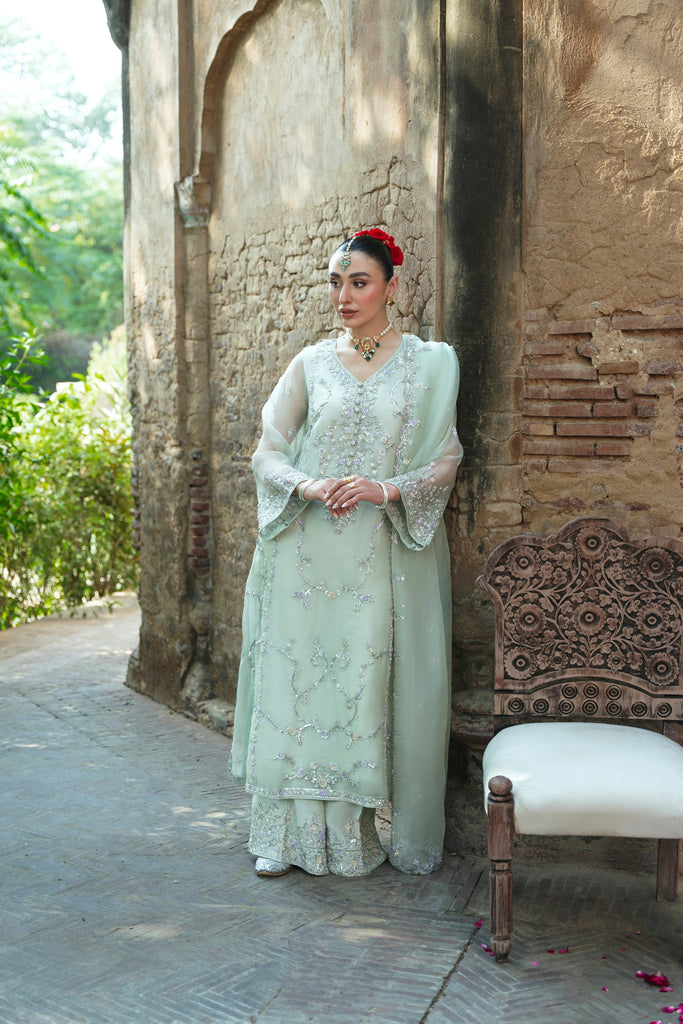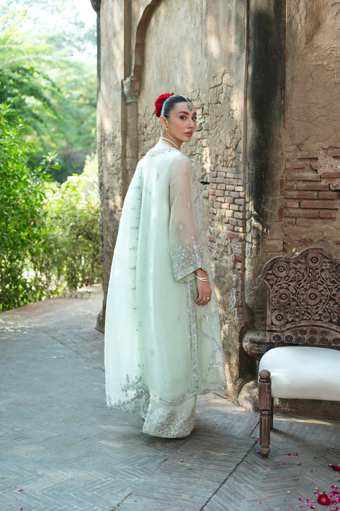 Curated on the finest soft tissue pure organza in the beautiful tone of mint green. Razia Sultan is adorned with the most intricate, silver Ada/ handwork of dabka, naqshi, sequins, moti and katori nug, done by our expert artisans, painstakingly taking upto 450+ hours. This design is paired with a matching pure soft tissue organza dupatta featuring delicate scalloped thoughtfully curated borders on four sides and a heavily embellished matching lzaar as seen. The length of the long kameez is 48 inches. The beauty of this design is that you can wear it in Nikkah and Valima events alike.