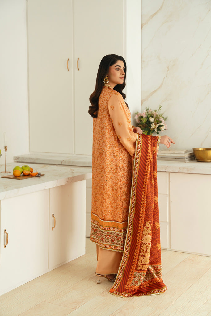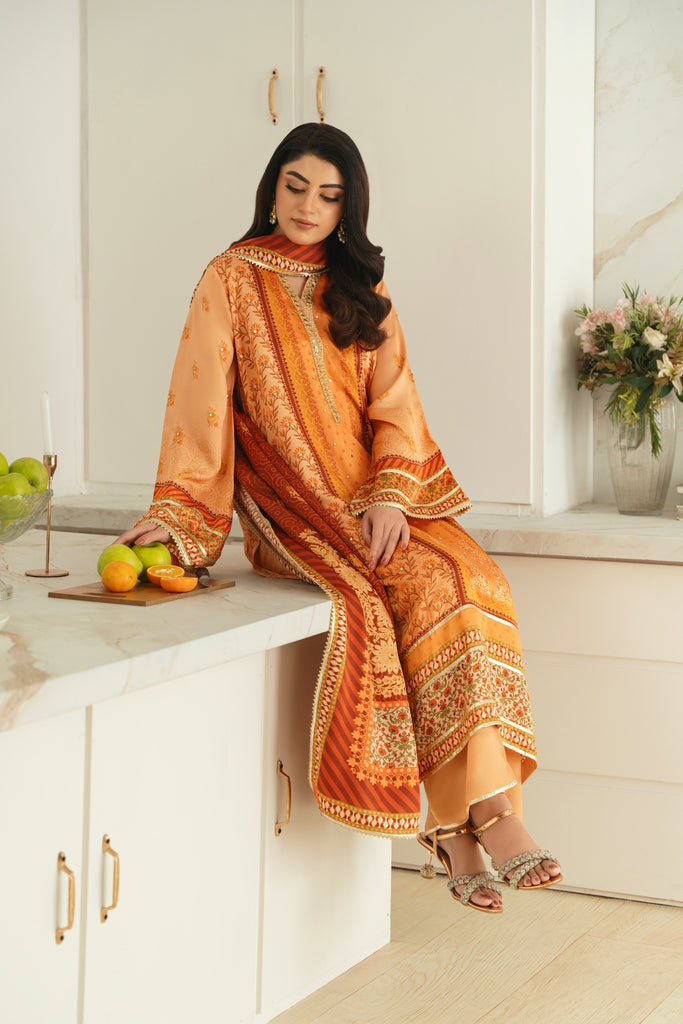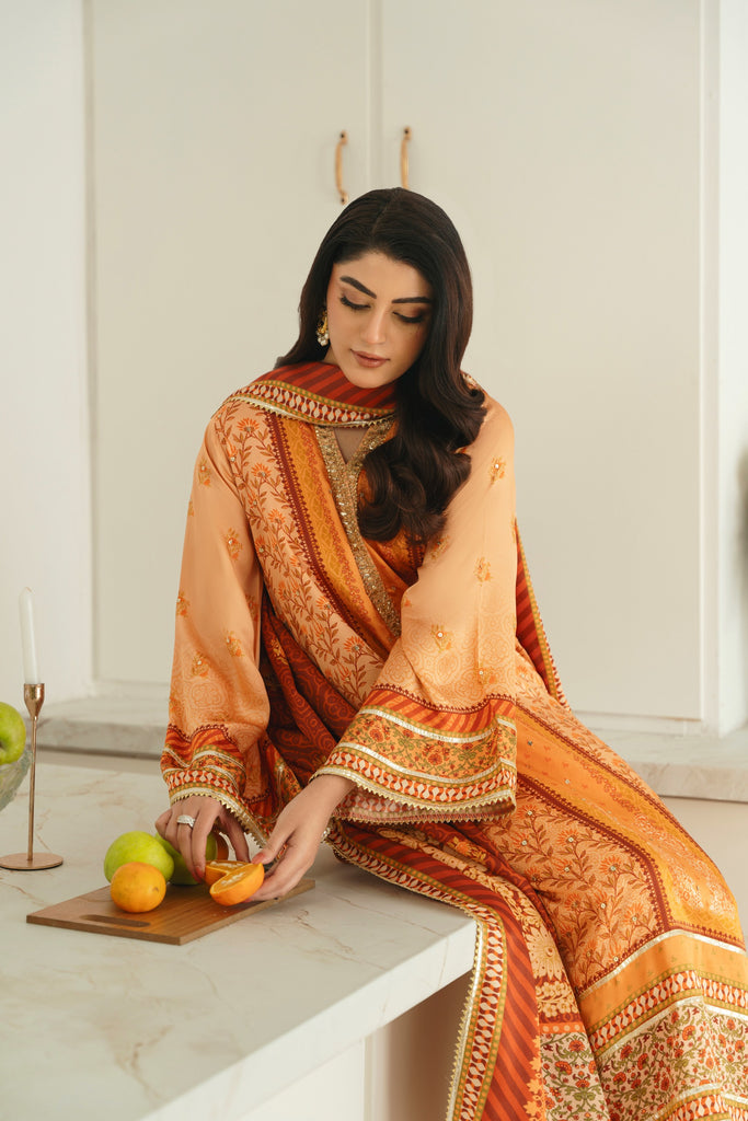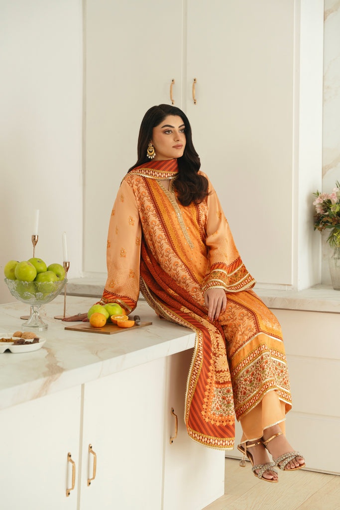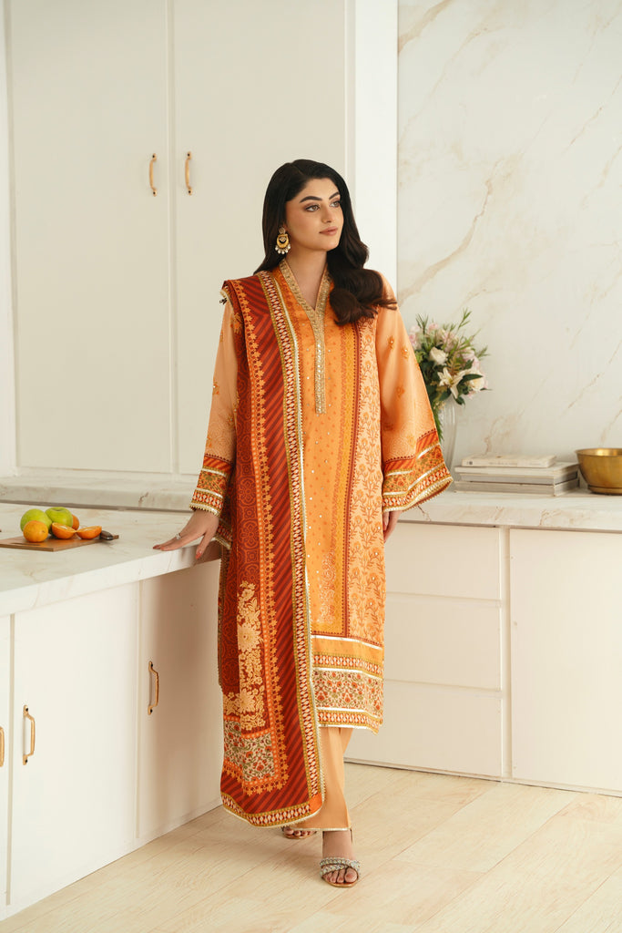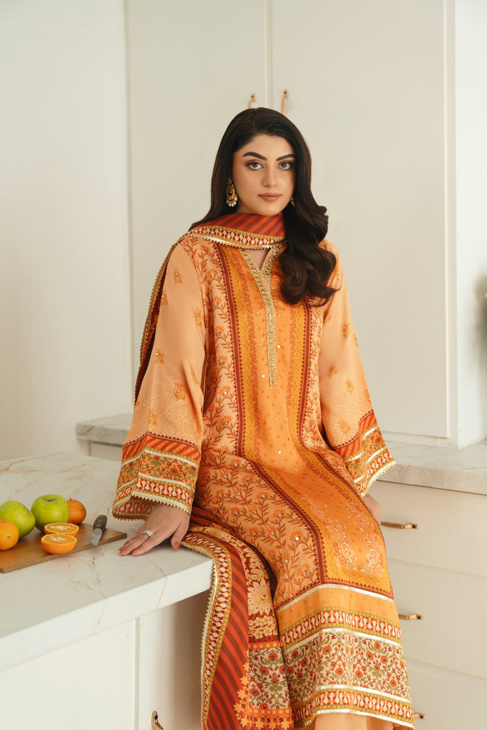 Curated on the finest soft raw silk, Sareefa is embellished with the most intricate nug details done by our expert artisans. This alluring design is paired with a matching printed charmeuse silk dupatta alongside a matching raw silk trousers as seen. The length of the long kameez is 47 inches. The beauty of this design is that you can wear it in soirées and daytime gatherings alike.
